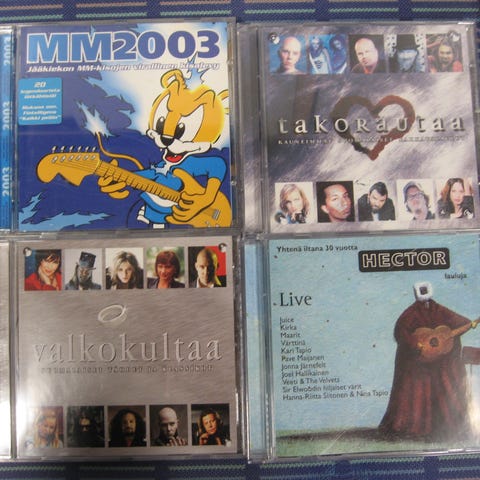 Myydään kotimaisia kokoelma cd-levyjä 3,00 euroa kappale. Kaikki cd:t kuunneltu ja todettu toimiviksi. Cd:ssä voi olla naarmuja & kansipapereissa jälkiä/omistuskirjoituksia, mutta cd-kotelot ovat ehjät. Postituskulut ostajalle ja noutokin sovittavissa.