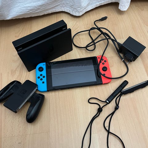 Nintendo Switch pelikonsoli, jossa mukana Joy-Con-ohjaimet eri väreissä. Konsoli on kannettava ja kotikäyttöön soveltuva laite.