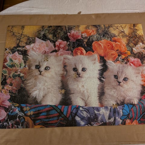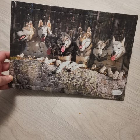 Laatikko, jossa kaksi palapeliä, huopakangas jonka päällä voi koota palapeliä. Paketissa myös liima.