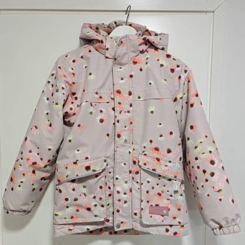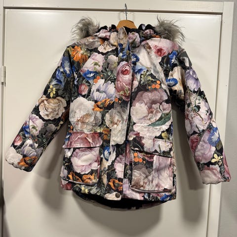 Molo Cathy fur still life -kuosilla. Koko 140cm, voi minusta ottaa käyttöön jo 134 koossa. Meille uutena tullut, yhdellä tytöllä käytetty useamman talvivaatteen ohella, kertaalleen pesty. Siisti, ehyt, hieman paikoin tyypillistä pehmentymää ja kulumaa esim heijastimissa, kauluksen sisäpuolella napin vieressä pieni kuluma. Tosi siisti toisellekin. Ovh 190e.