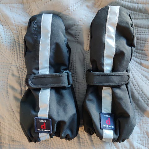 Popin käytössä olleet, mutta mielestäni uudenveroisessa kunnossa olevat toppahanskat. Kokomerkintä 1, 6-12 kuukautta. Sivussa vetoketju pukemista helpottamassa.