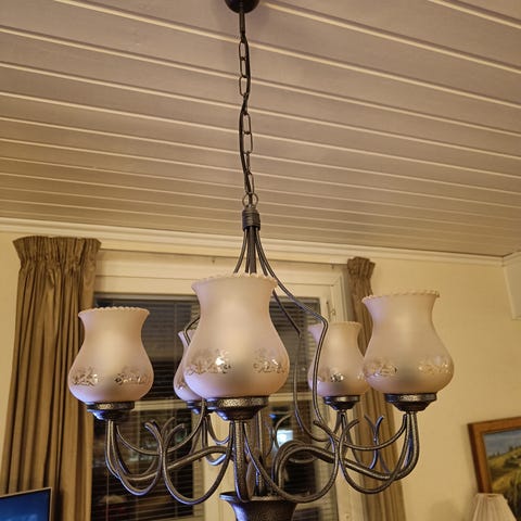 Tarpeettomaksi jäänyt kattovalaisin. Ehjä, siisti. Lasikuvut, metalli runko. Max. 40w.