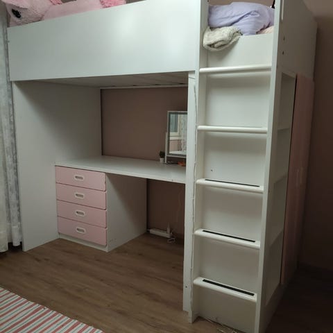 Todella hyväkuntoinen puinen, mänty parvisänky. Patjan leveys 80cm, jonka saa kaupan päälle. Portaat irrotettavat, liikuteltavissa eri puolille.