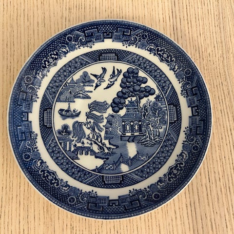 Arabian leimoilla varustettu Blue Willow sarjan tarjoilulautanen, jota pidetty seinälautasena. Reunassa pieni halkeama (katso kuva).