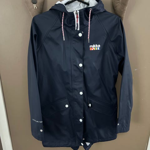 Rukka-sadetakki. Ruskea. Koko 38, mutta reilua kokoa. Hieman pidempi malli. 2000-luvulta. Edessä vetoketju sekä painonapit, viistot suojaläpälliset taskut ja hupussa verkkovuori sekä pikalukollinen nauha.