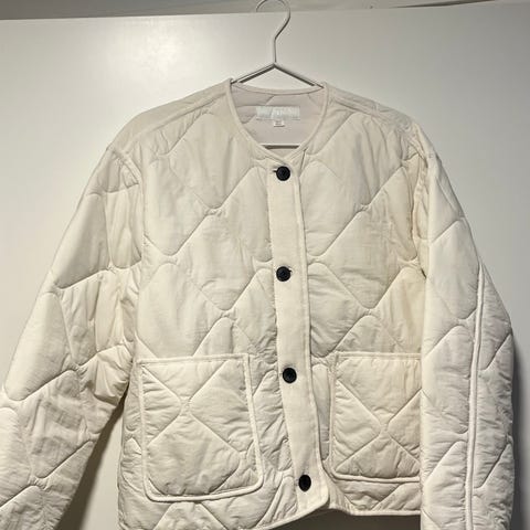 Vähän käytetty sininen toppatakki. Ohut huppu, jonka saa kauluksen sisään piiloon. Hihansuissa resorit ja kauniit yksityiskohdat. Vetoketjutaskut.