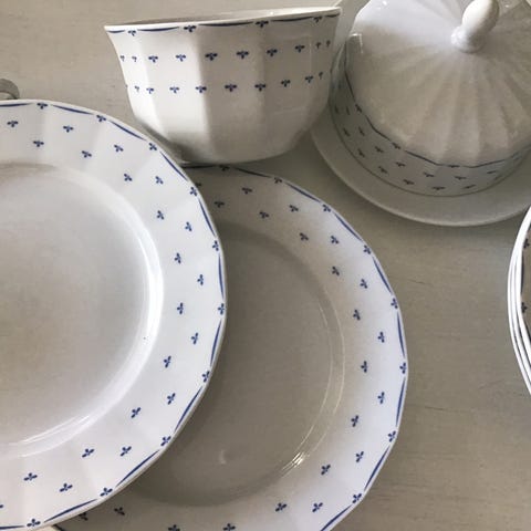Siniset ruokalautaset 5 kpl, pikku asetit 5 kpl, jälkiruoka-astiat 6 kpl, vesikarahvi, tuikku astia, pieni tarjoilu kulho, maljakko, tuikkuastiat 3 kpl, kannellinen astia jonka reunasta pieni pala on pois, lisäksi 13 kpl laseja. Kysele rohkeasti hintoja myyn kaikki edullisesti.