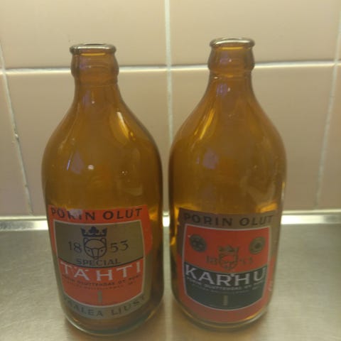 Karhu Olut Oluenpullo, koko 0,5 litraa, ruskeaa lasia. Setti sisältää kaksi pulloa.