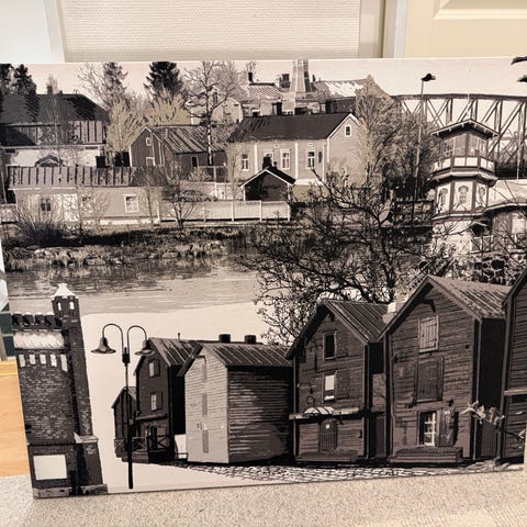 Vallilan Oulu aiheisesta kankaasta tehty taulu