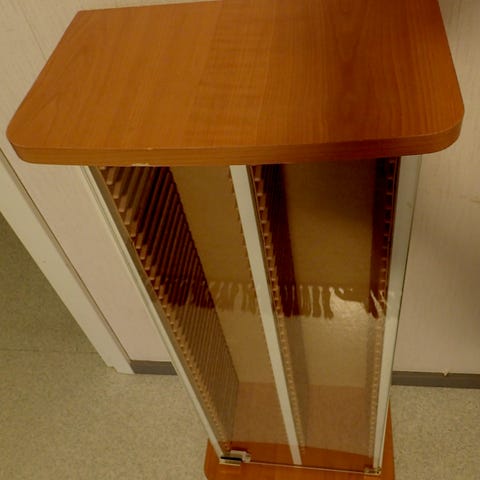 Tyylikäs CD/DVD - teline liukuvalla rulo-ovimekanismilla. Yksi pieni käytönjälki viimeisessä kuvassa, rulo-oven verkossa, mutta ei näy käytännössä