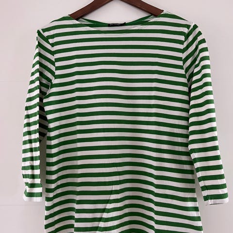 Todella tumman vihreä-valko raitainen Marimekon Ilma pitkähihainen t-paita. Hihat 2/3 pituus.