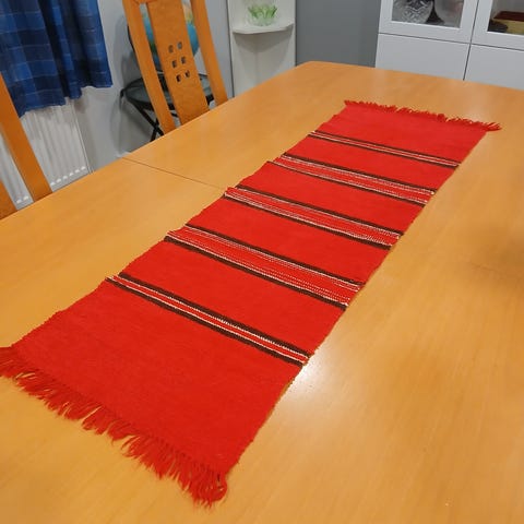 Kuvanmukainen siistikuntoinen kaitaliina. Poppanan sekaan kudottu kultalankaa. Liinan päät ovat hieman eriväriset keskiosaan nähden, kuvat 3 ja 4.