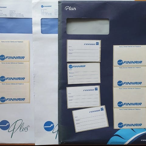 Myydään Finnair kirjekuoret, 2 kpl ja nimi- ja osoitelaput 17 kpl. Yhteishinta 35 euroa voi ostaa erikseen 2 euroa kpl. Nouto tai postitus.