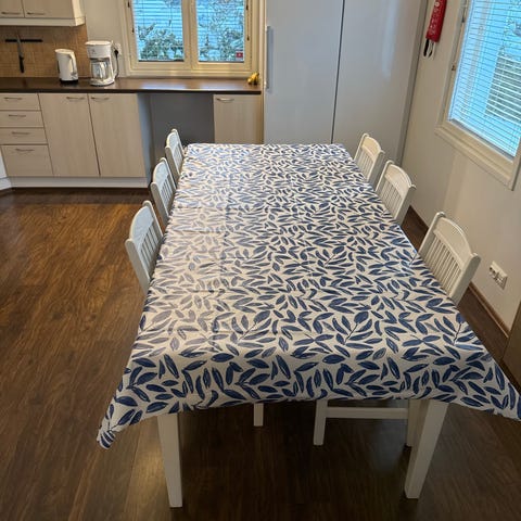Käytetty ja jälkiä on. Pöydän pinta on käsiteltävissä. Pöytä ei keiku tai notku.