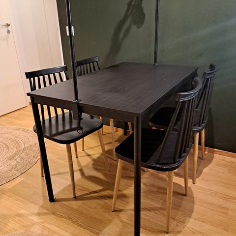 IKEA ruokapöytä ja tuolit mustalla värillä. Pöytä ja tuolit ovat valmistettu puumateriaalista. Sopii ruokailutilaan tai keittiöön.