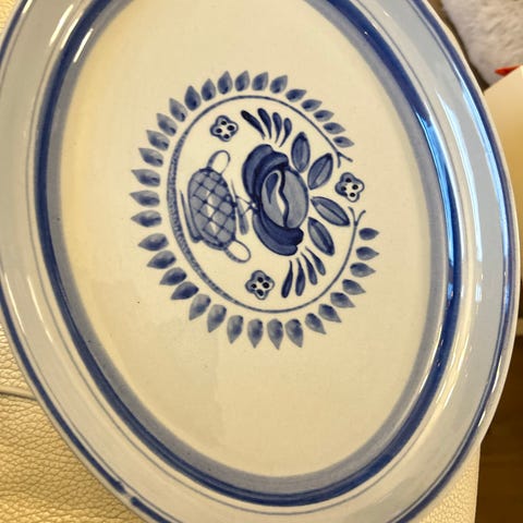 Arabia Blue Rose iso tarjoiluvati, posliinia. Tarjoiluvati on valkoinen sinisellä kukkakoristeella ja sinisellä reunuksella. Soveltuu tarjoiluun ja kattaukseen.
