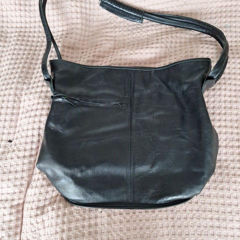 Pieni hyväkuntoinen musta (tekonahka-?) laukku. Ulkopuolella yksi vetoketjutasku, sisällä toinen. Lisäksi sisällä muita pikkutaskuja esim. korteille. Laukun yläreunassa reikäkoristekuvio ja vetoketjussa nahkatupsu. Olkahihna säädettävä. Laukun mitat noin 23cm x 15cm.