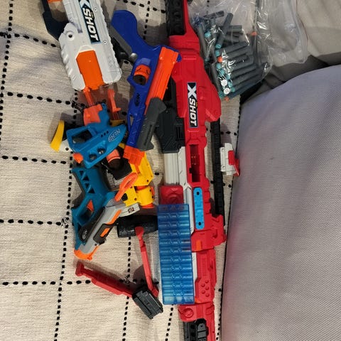 Mukana lisäksi useita vaahtomuovisia ammuksia eri väreissä, joista osa käyttämättömiä. Ammusten kunto vaikuttaa paljon pyssyjen kantavuuteen ja uusia saa aina hyvin varustelluista ruokakaupoista.