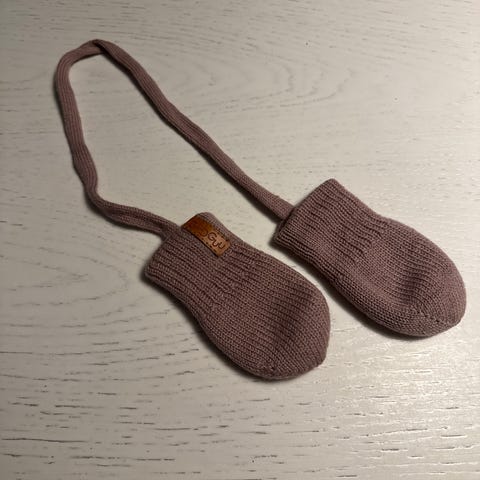 Gugguun merinovillaiset lapaset / tumput vastasyntyneelle. Kutistuneet pesussa.