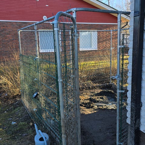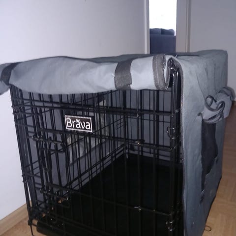 Kahden koiran häkki, keskellä väliseinä (saa poistettua) Kaksi ovea. Siistissä kunnossa. Korkeus 69 cm, leveys 97 cm, syvyys yläreunassa 57 cm ja pohjassa 91 cm