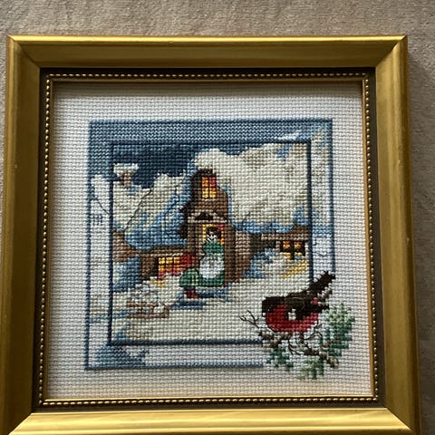 Näyttävä joulutaulu pienin ristipistoin.Vuorattu,ripustus lenkki.Koko 54x40 cm.God Jul !
