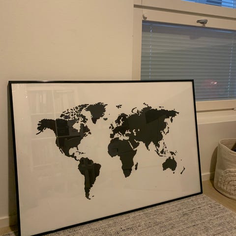 Mustat kehykset Ikeasta, metallia ja muovia. Koko 70 x 100 cm. Näissä paljon käytön jälkiä, isommista jäljistä kuvat.