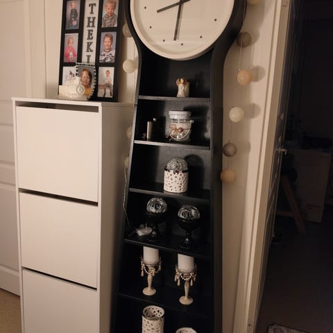 Alkuperästä ei tietoa, mutta mitä ilmeisimmin jonkun tee-se-itse -henkilön rakentama hauska kapistus. Punnuksilla ja heilurilla kulkeva koneisto toimii ja kello lyö komeasti. Jätättää nyt hiukan, mutta koneistoahan voi säätää ja kokeillen etsiä oikean nopeuden. Kaikkea pientä korjattavaa löytyy jos haluaa, mutta tällaisenaan on ollut meillä virassaan, eli näyttämässä aikaa.