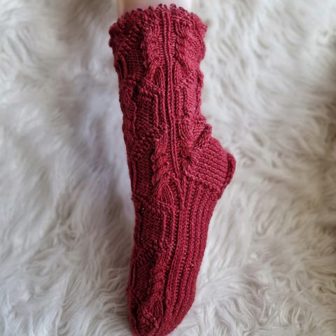 Hakusanat: villasukat, villasukka, sukat, neuletyöt, neuletyö, pitkävartiset, asusteet, pitsineule, palmikkoneule, pitsikuvio, viininpunainen, harmaa, jäkälä, joulu, syksy, joulusukat