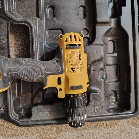 DeWalt akkukäyttöiset porakone ja mutteriväännin pakrttina. Työkalut ovat käytettyjä ja näkyy käytön jälkiä.