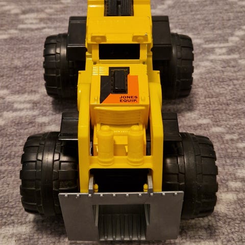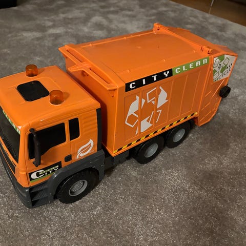 Iso jäteauto. Äänet ja valot toimivat. Etu haarukka nousee ja laskee vivusta. Ei pattereita mukana. Toimii kahdella AA paristolla.