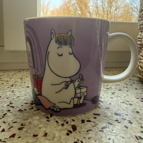 Siistikuntoiset Arabian Muumi Niiskuneiti ja runoilija muki & kulho. Muki tarrallinen