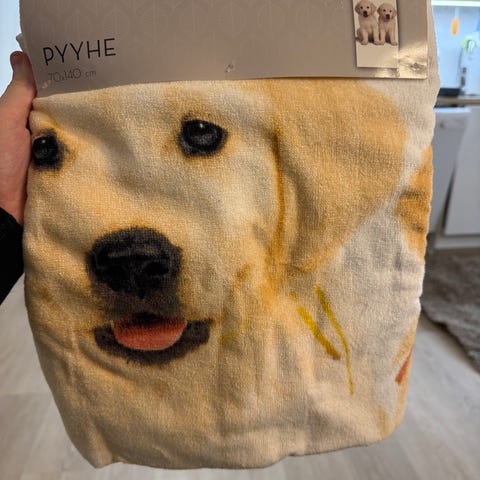 Uusi koiramäki-kangaskassi ja pyyhe. Molemmat avaamattomia.