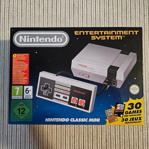 Nintendo Classic Mini Nintendo 8-bit -pelikonsoli sisältää 30 esiasennettua klassista peliä. Konsoli on pienoiskoossa alkuperäisen Nintendo Entertainment Systemin (NES) kanssa ja tarjoaa retro-pelikokemuksen. Mukana konsoli, ohajain + virtajohto. Vähällä käytöllä ollut.