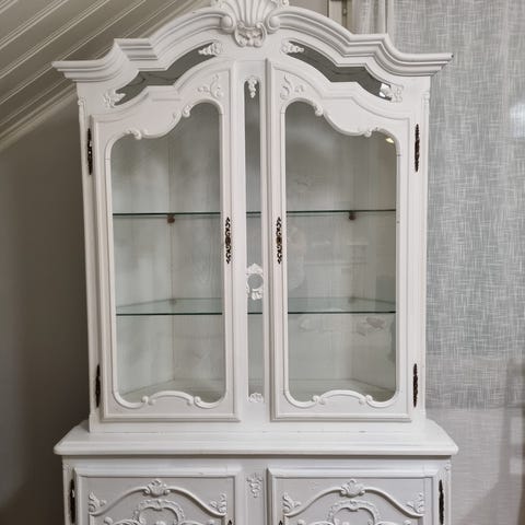 Valkoinen vitriinikappi neljällä lasiovella. Alaosassa umpihylly. Yläosassa 4 lasihyllyä ja 1 kiinteä umpihylly. Kuljetettava kokonaisena, ei voi laittaaa osiin. Vain nouto.