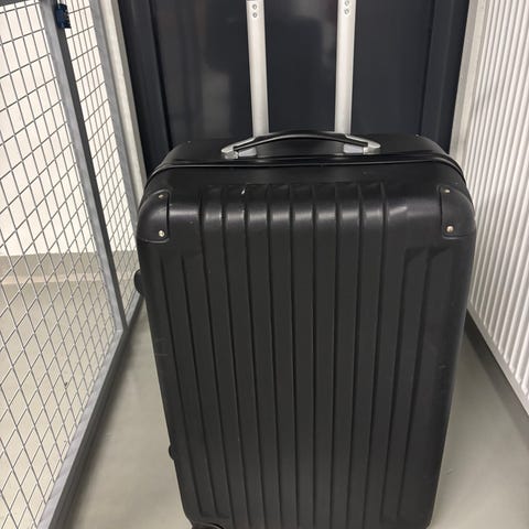 Iso kangaspintainen violetti ehjä matkalaukku, ostettu hätävarana etelän matkalla laukkuliikkeestä sen jälkeen ollut komerossa vaatteiden säilytyslaukkuna.