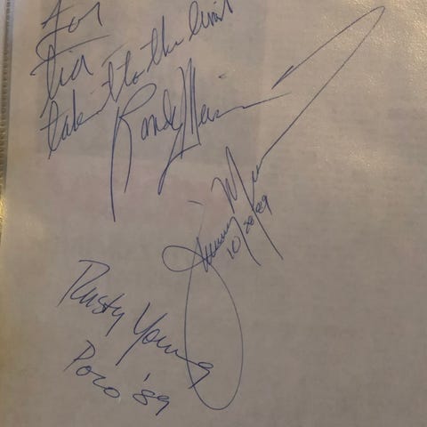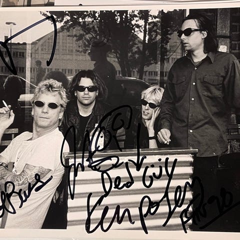 Woude -yhtyeen nimikirjoitukset 9x13 valokuvan takapuolella.