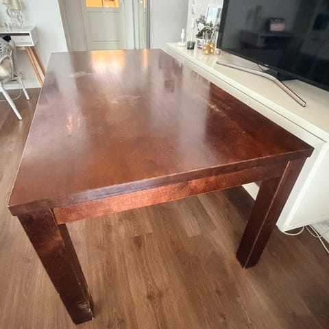 Puinen tukeva ruokapöytä, molemmilla sivuilla on vetolaatikko. Pöydässä käytön jälkiä, mutta täysin kunnossa.