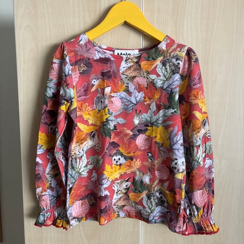 Pumpulipupupaita kokoa 128, mutta nafti. Muutama pistetahra. Korvassa oleva on varmasti tahra, sinisestä kohdasta en ole varma kuuluuko kuvioon. Selkäpuoli kokonaan harmaa.