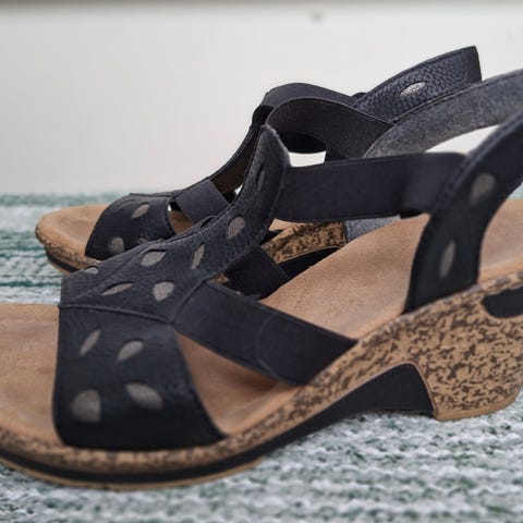 Rieker naisten sandaalit, koko 39. Mustat sandaalit, joissa on solmuke-yksityiskohta ja kiilakorko. Mukavat jalassa.