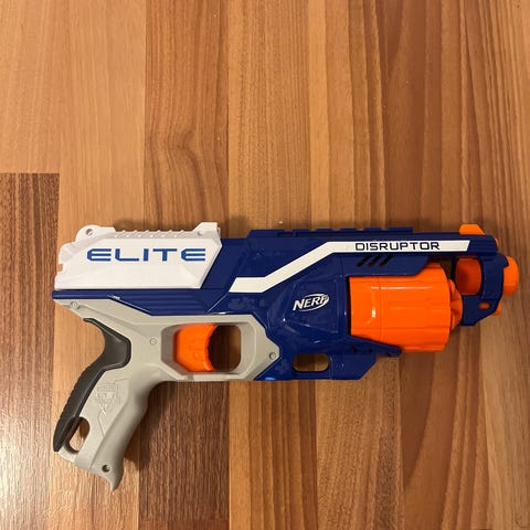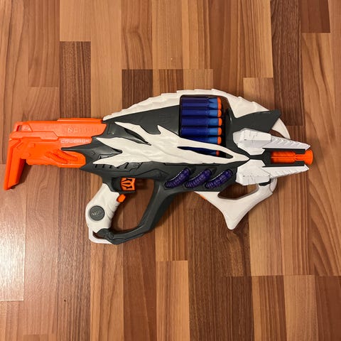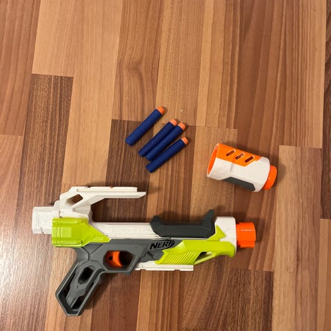 Nerf Retaliator Elite lasten leluase, jossa on irrotettavia osia. Sopii lasten leikkeihin ja leluaseiden keräilyyn. 10 panoksen lipas. Panoksia ei tule mukaan