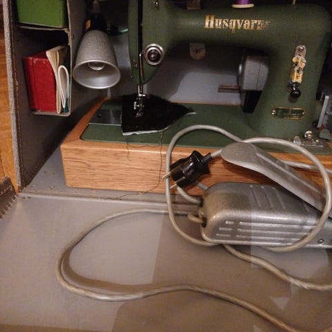 Vanha Husqvarna -ompelukone jalustalla