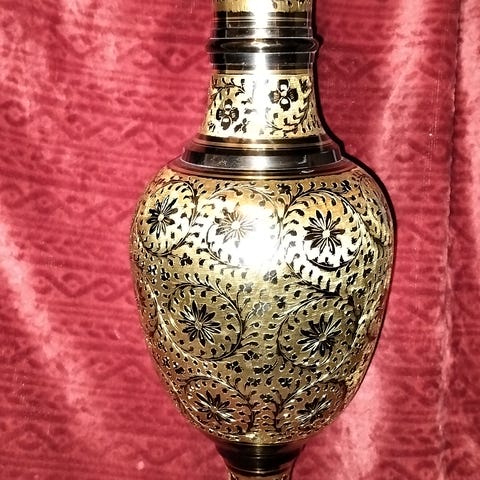 Messinki käsinkoristeltu vaasi,uusi,ollut koristeena ja EIkulunut,upea käsityötä