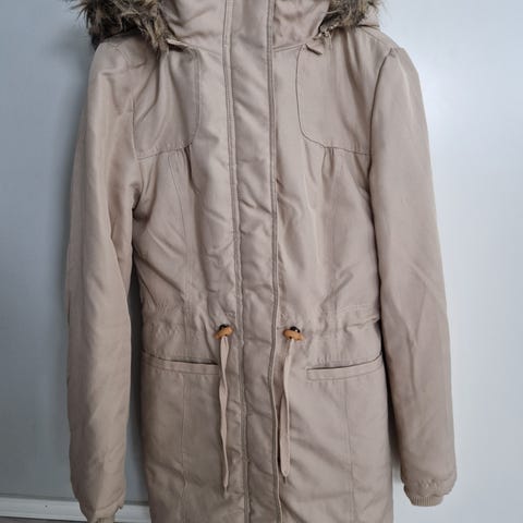 Vilan harmaa pitkä toppatakki. Vyötäröllä joustava vyö nepparikiinnityksellä. Irrotettava huppu, jossa myös irrotettava karvareunus. Siistissä kunnossa.