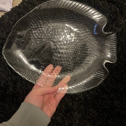 Lasinen kalalautanen, n.30cm. Säilytetty hyvin, homeeton ja hajuton. Voin lähettää.