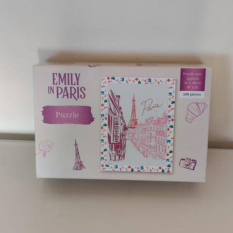 Emily in Paris palapeli, koko 500 palaa. Palapelin kuva-aihe liittyy televisiosarjaan Emily in Paris. Kerran koottu.