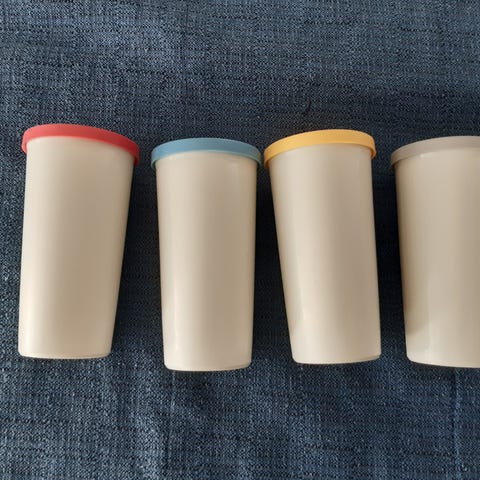 Uudet Tupperwaren nestetiiviillä kannella olevat mukit, 330 ml, joten käyvät myös nesteiden kuljettamiseen, 4 kpl.