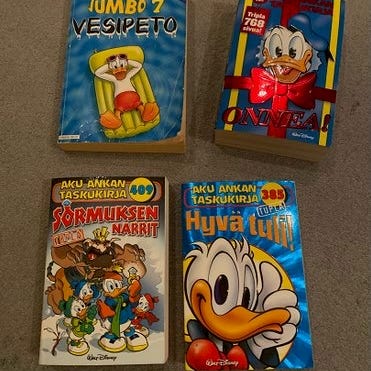 Aku Ankan taskukirjoja. Joulu teemaa ja jumbo 3 ja 10. Jumbo 3:a vähän teipattu. Kunto muuten ok.