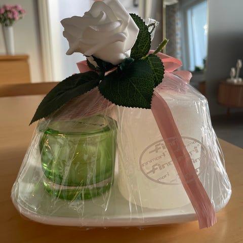 Finnmarin valmis lahjapakkaus, jossa on tuikkukippo lasisen, jalallisen lautasen päällä. Lasilautasen halkaisija n. 15 cm.