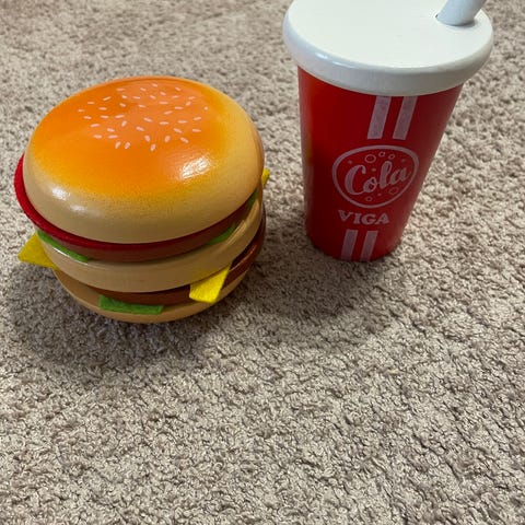 Hampurilaisateria: Muuten hyväkuntoinen, mutta yhdestä ranskiksesta joku haukannut ja on pienet hampaanjäljet🙈 (voi jättää pois, jos häiritsee). Hampurilaisen voi purkaa ja koota haluamillaan täytteillä.