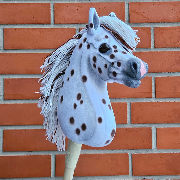 Tämä suloinen, pippurinen ja täplikäs keppari kääntää katseet! Se on pienikokoinen ja kevyt, ja sopii tämän vuoksi mainiosti estehyppelyyn. Sen sielukkaat siniset herasilmät on käsinmaalattua nahkaa, ja ne on huolellisesti liimattu paikoilleen. Kirjava harja on villasekoitelankaa ja korvissa kovikkeet. Realistisuutta lisäävät upotetut sieraimet.